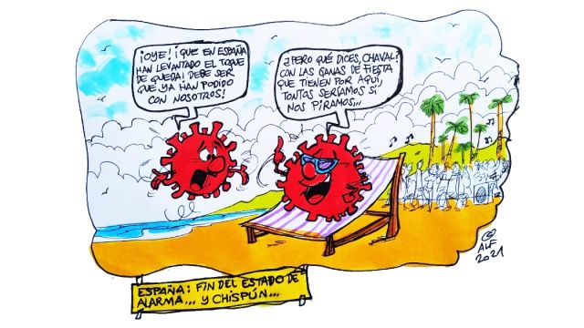El fin del estado de alarma saca a una multitud a las calles a pesar de que hay 600 muertes por coronavirus de media a la semana. Alfredo Boto-Hervás lo refleja así en su viñeta.