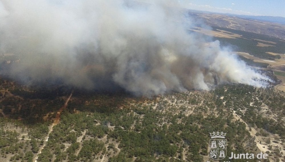 Numerosos medios aéreos y efectivos terrestres de la Junta de Castilla y León y de la Administración General del Estado se han desplazado y actúan en las labores de extinción de este incendio que afecta principalmente a masa arbolada de pinar y cultivo agrario.
