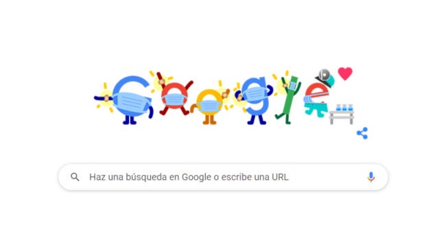 En el doodle de Google, todos las letras del gigante tecnológico se muestran con mascarillas. La letra 'e' al final es un profesional sanitario que inocula dosis de la vacuna a las otras letras. Una vez que todas han recibido la vacuna Covid-19, levantan los brazos para instar a todos a vacunarse.