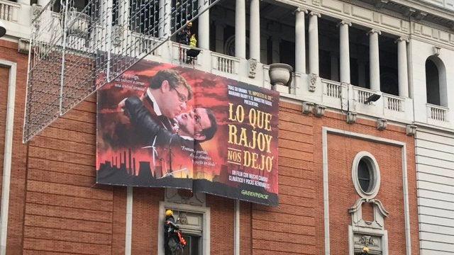 La ONG ambientalista Greenpeace ha desplegado este viernes en el antiguo Palacio de la Música de Gran Vía una pancarta en la que parodian al presidente del Gobierno, Mariano Rajoy, y al ministro de Energía, Turismo y Agenda Digital, Alvaro Nadal, como los protagonistas de 'Lo que el viento se llevó' para criticar su "impuesto al sol" y la inacción ante el cambio climático.