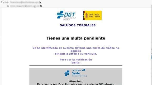 Si reciben un mail que asegura ser la Dirección General de Tráfico (DGT), hay que ir con cuidado. La Guardia Civil ha alertado de un nuevo tipo de estafa relacionada con falsas multas de tráfico. Los estafadores utilizan una fraudulenta campaña de correos electrónicos, conocida como método 'phishing', con el que suplantan a la DGT.