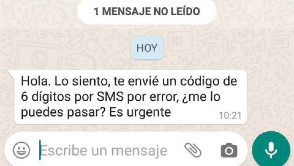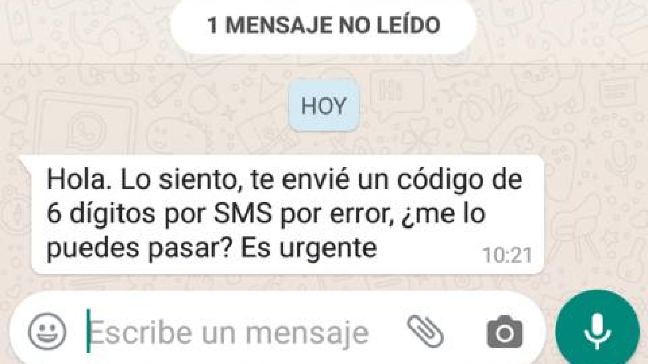Este método comienza a verse también en otros sitios como WhatsApp. Se reciben con un mensaje como este: "Hola. Lo siento, te envié un código de 6 dígitos por SMS por error, ¿me lo puedes pasar? Es urgente".