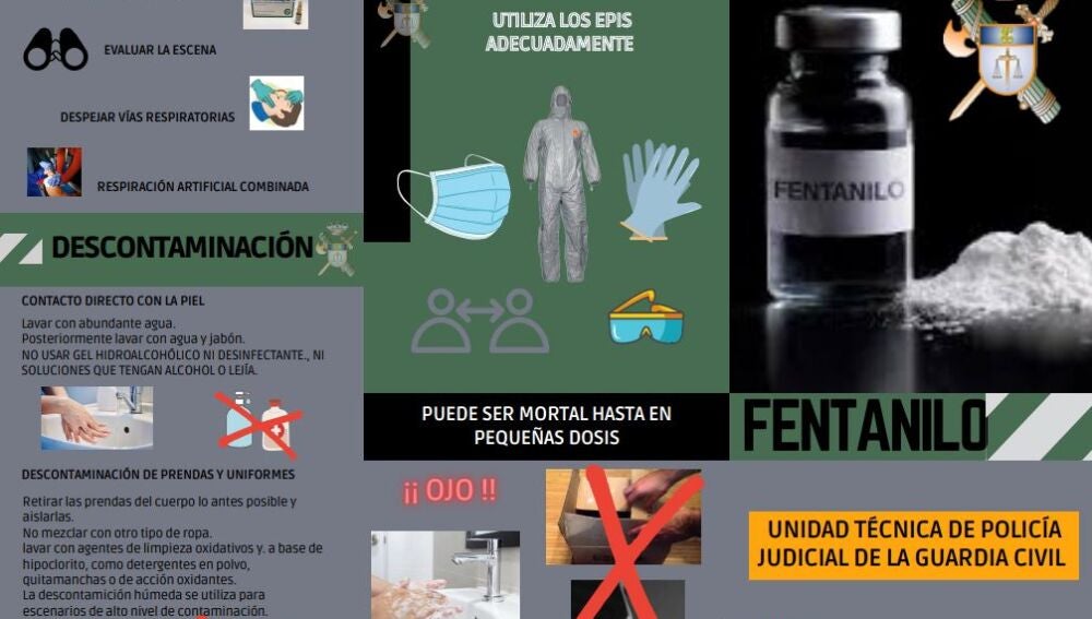 Y ¿qué hacer en caso de intoxicación accidental? El tríptico de la Guardia Civil recomienda administrar naloxona, un antagonista de los opioides, despejar las vías respiratorias y suministrar respiración artificial. En caso de contacto directo con la piel, los agentes deben lavar con abundante agua y, posteriormente, con agua y jabón, y "no usar gel hidroalcohólico, desinfectante ni soluciones que contengan alcohol o lejía".