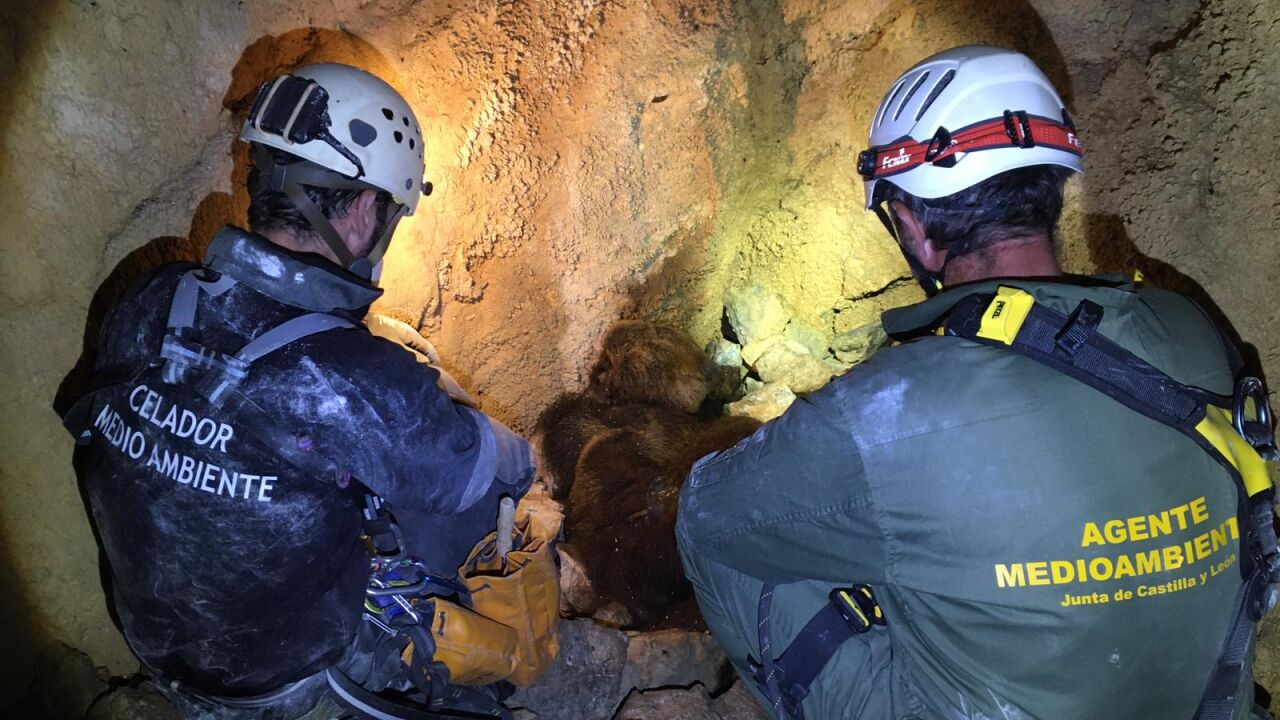 Agentes medioambientales y celadores de Medio Ambiente de la Junta de Castilla y León han localizado en una sima vertical de 33 metros de profundidad los restos de la osa despeñada junto a su osezno en el mes de junio, junto al cadáver de otra cría desaparecida los días previos.