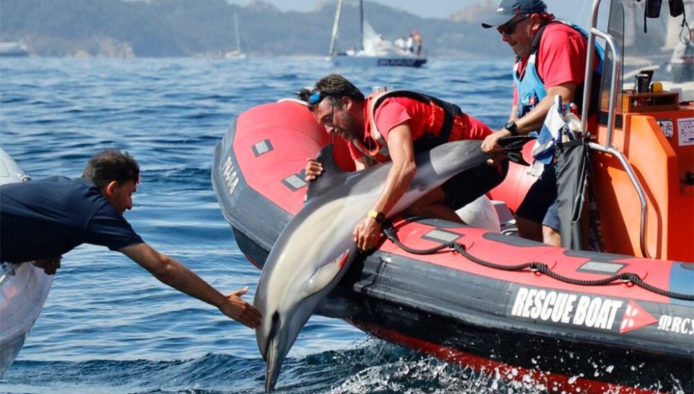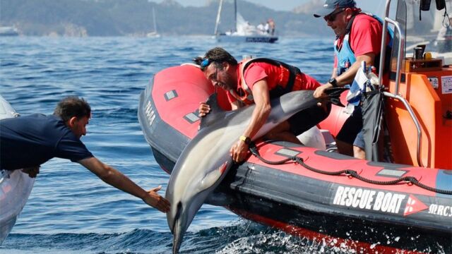 Fue uno de los barcos de la competición del Mundial J80 Baiona, que estos días se celebra en las Rías Baixas, el que dio la voz de alarma. Habían avistado a un delfín atrapado en un aparejo y precisaba ayuda. Los participantes del evento no dudaron en socorrerle y pronto se desplazaron a la zona en un zodíaco para conseguir liberar al animal.