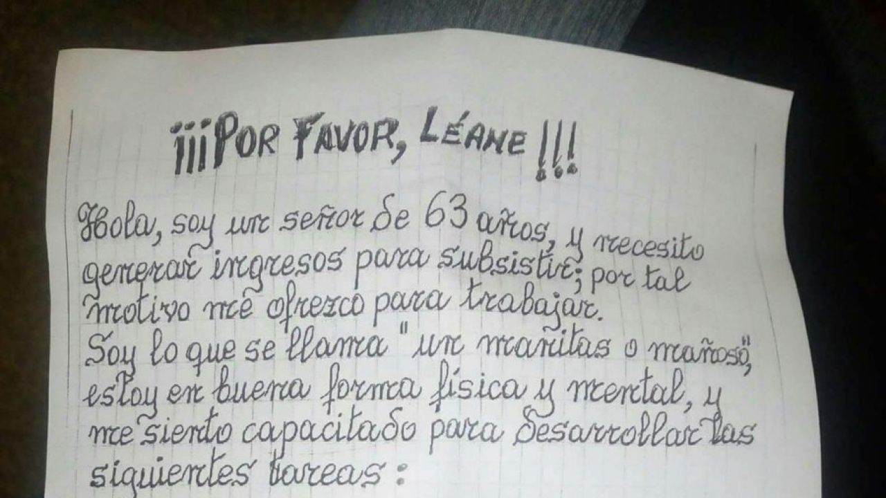 Antonio es un hombre de 63 años que ha escrito una carta para lograr encontrar un trabajo. Su carta comienza con un reclamo de atención con el que conseguir que alguien continúe leyendo. "Por favor, léame", escribe con grandes letras.