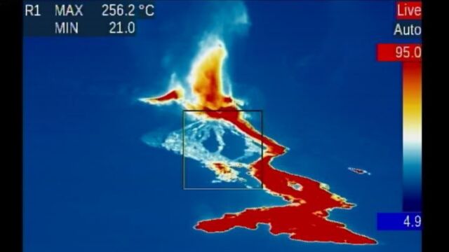 "Medios aéreos del Ministerio se han movilizado en una misión extraordinaria para seguir con cámaras infrarrojas la actividad volcánica en La Palma", reza el mensaje de la cartera de Teresa Ribera, que acompaña dos instantáneas. Una con la actividad magmática registrada por rayos infrarrojos y otra, una panorámica, en la que se ve parte del volcán y la montaña por la que descienden las lenguas de lava.