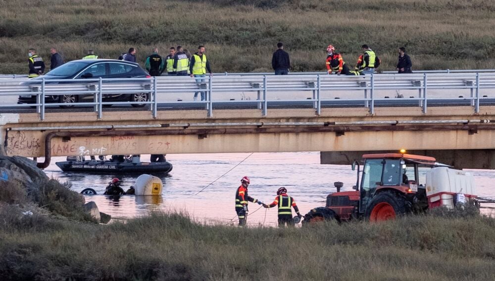 Tras un largo operativo y dada la fuerza de la corriente y la nula visibilidad, que hacía imposible acceder al interior del vehículo, los buzos, bomberos y un camión con pluma han conseguido extraer el vehículo.