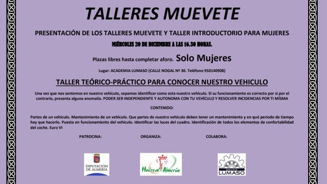 El curso, con certificado final expedido por la Junta de Andalucía, contempla cuatro sesiones en las que se explicarán conceptos introductorios para el conocimiento del automóvil y su funcionamiento en un centro oficial.