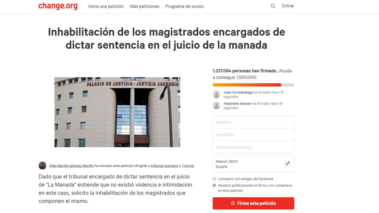 Más de un millón y medio de personas han apoyado en poco más de 48 horas la petición de inhabilitación de los magistrados de la Audiencia Provincial de Navarra encargados de dictar sentencia en el juicio de la Manada en las primeras horas de la campaña que se ha puesto en marcha la tarde del jueves en la plataforma Change.org. La recogida de firmas se ha iniciado horas después de que el citado tribunal entendiera que "no existió violencia e intimidación" por parte de los cinco miembros del grupo la Manada, que han sido condenados a nueve años de cárcel cada uno por abusar sexualmente de una joven durante los sanfermines de 2016.