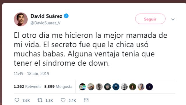 Sí, este es el texto de tu tweet: "El otro día me hicieron la mejor mamada de mi vida. El secreto fue que la chica usó muchas babas. Alguna ventaja tenía que tener el síndrome de down". (David Suárez)