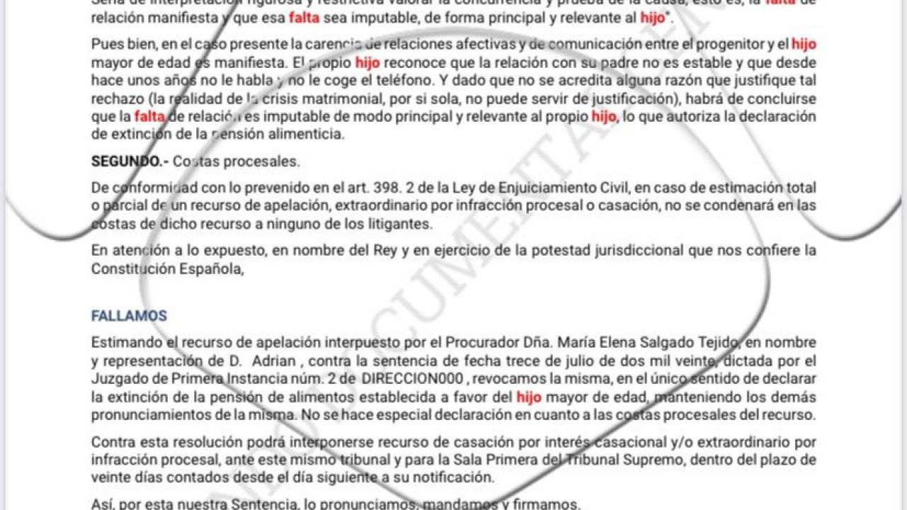 Además, en el juicio el joven reconoció no contestar al teléfono cuando le llama su padre, ignorarle cuando lo encuentra por la calle y tener una mala relación con él. Los jueces, amparados en el artículo 152 del Código Civil y en estas últimas conductas, han decidido retirar la pensión al veinteañero.