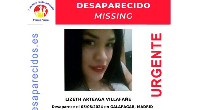 Lizeth Arteaga Villañe, una mujer de 32 años y madre de tres hijos, se encuentra desaparecida desde el 5 de agosto de 2024. Fue vista por última vez en Galapagar, Madrid, y tanto la Asociación SOS Desaparecidos como el Centro Nacional de Desaparecidos (CNDES) han emitido alertas de búsqueda, además se trata de una persona vulnerable. Lizeth, de 1,60 metros de altura, pelo negro largo y complexión delgada, dejó de comunicarse abruptamente tras asegurar haber encontrado trabajo como cuidadora.