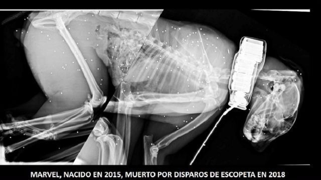 Asimismo, ha remarcado que además de "un disparo a bocajarro" que la necropsia realizada a este ejemplar macho -Marvel- ha revelado como causa de la muerte, se han detectado en su cuerpo la presencia de más de 300 plomos de escopeta.