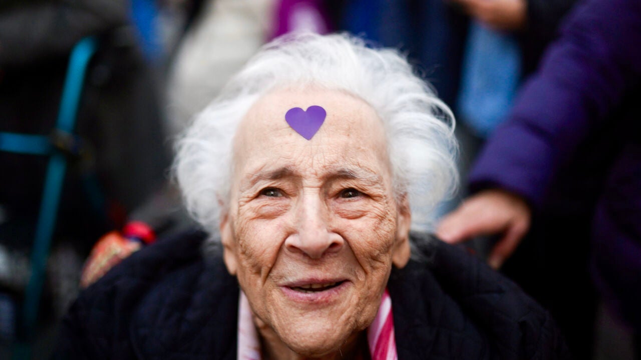 Una mujer de avanzada edad con un corazón morado en la frente durante la manifestaciones del 8M en Sevilla (Andalucía).