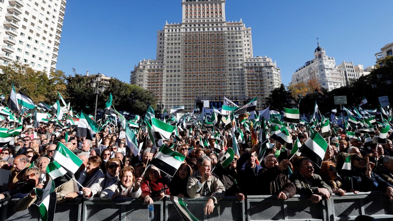 Miles de extremeños han abarrotad la Plaza de España de Madrid y algunas de sus calles aledañas para exigir un "tren digno" del siglo XXI para la región, ya que tiene una red ferroviaria de vía única, sin electrificar y con trenes de media distancia, una situación que consideran "injusta".