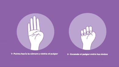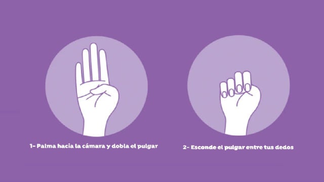 La organización Canadian 'Women's Foundation' ideó hace unos meses una forma discreta para que las mujeres víctimas de violencia de género pudieran pedir ayuda. El gesto consiste en abrir la mano y estirar los dedos, con la palma mirando hacia fuera. Posteriormente hay que esconder el dedo pulgar dentro de la palma y finalmente doblar los otros cuatro dedos encima del pulgar.