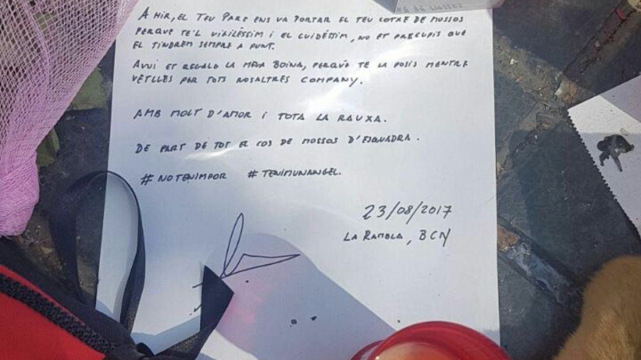 En la nota que han dejado los agentes en honor a Xavi se puede leer: "#notenimpor #tenimunangel" (No tenemos miedo, tenemos un ángel).