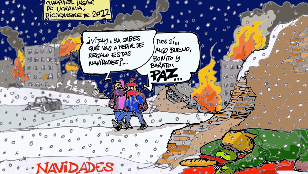Unas navidades marcadas por esta guerra en Ucrania son las protagonistas de la nueva viñeta gráfica de nuestro ilustrador Alfredo Boto-Hervás. "Cualquier lugar de Ucrania, diciembre de 2022. Vitaly, ¿ya sabes que vas a pedir de regalo estas navidades? Pues sí. Algo bueno, bonito y barato: paz", es lo que se puede leer en la viñeta, la que probablemente será la petición de todos los ucranianos para el nuevo año 2023.