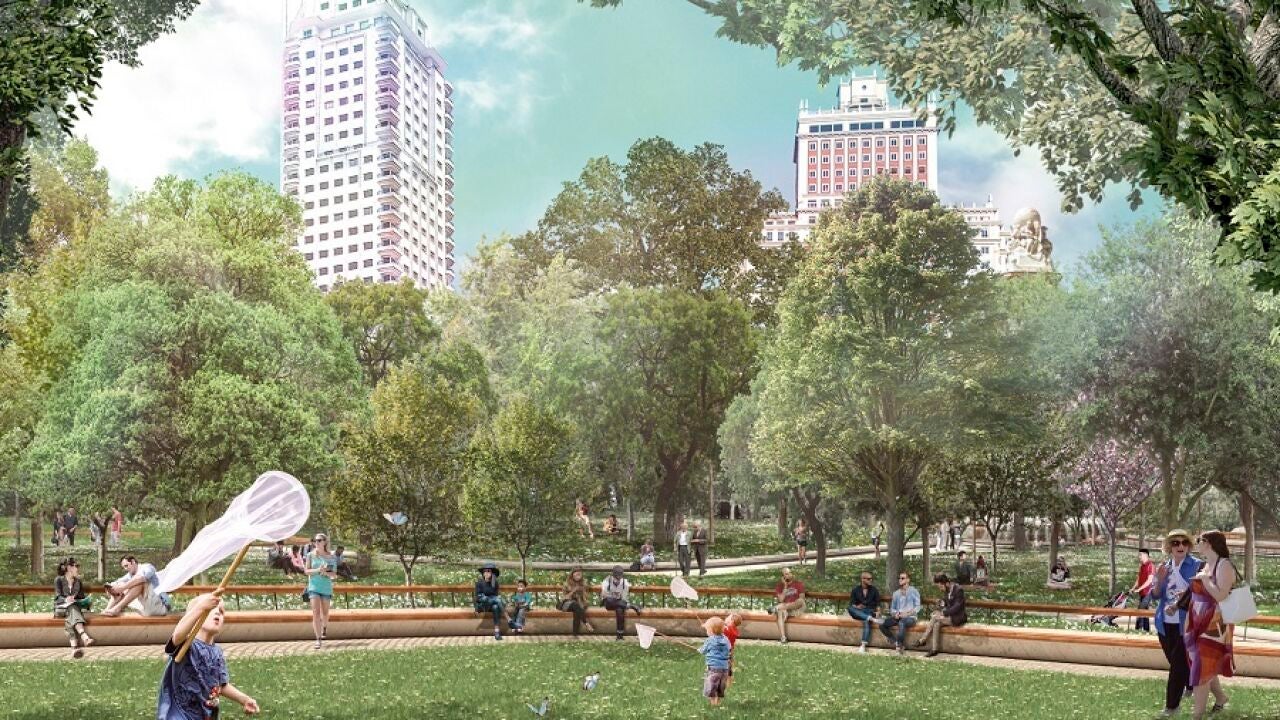 La nueva Plaza de España en Madrid, que "se extiende hasta besar los pies de los edificios y así amplía notablemente su superficie". Además, se concibe como "una alfombra mullida desde Princesa hasta los Jardines de Sabatini, desde Gran Vía a Bailén, desde la Plaza de Oriente hasta el parque del Oeste".