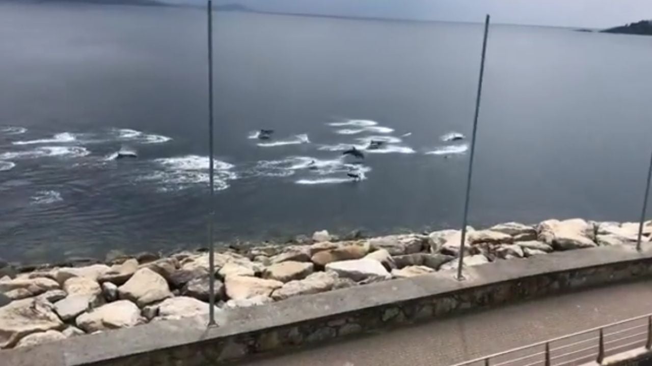 Una numerosa manada de delfines se ha visto pegada a la costa de Sanxenxo, en Galicia. Sus llamativos saltos han sorprendido a los vecinos de la localidad, que no se esperaban la visita de los cetáceos.
