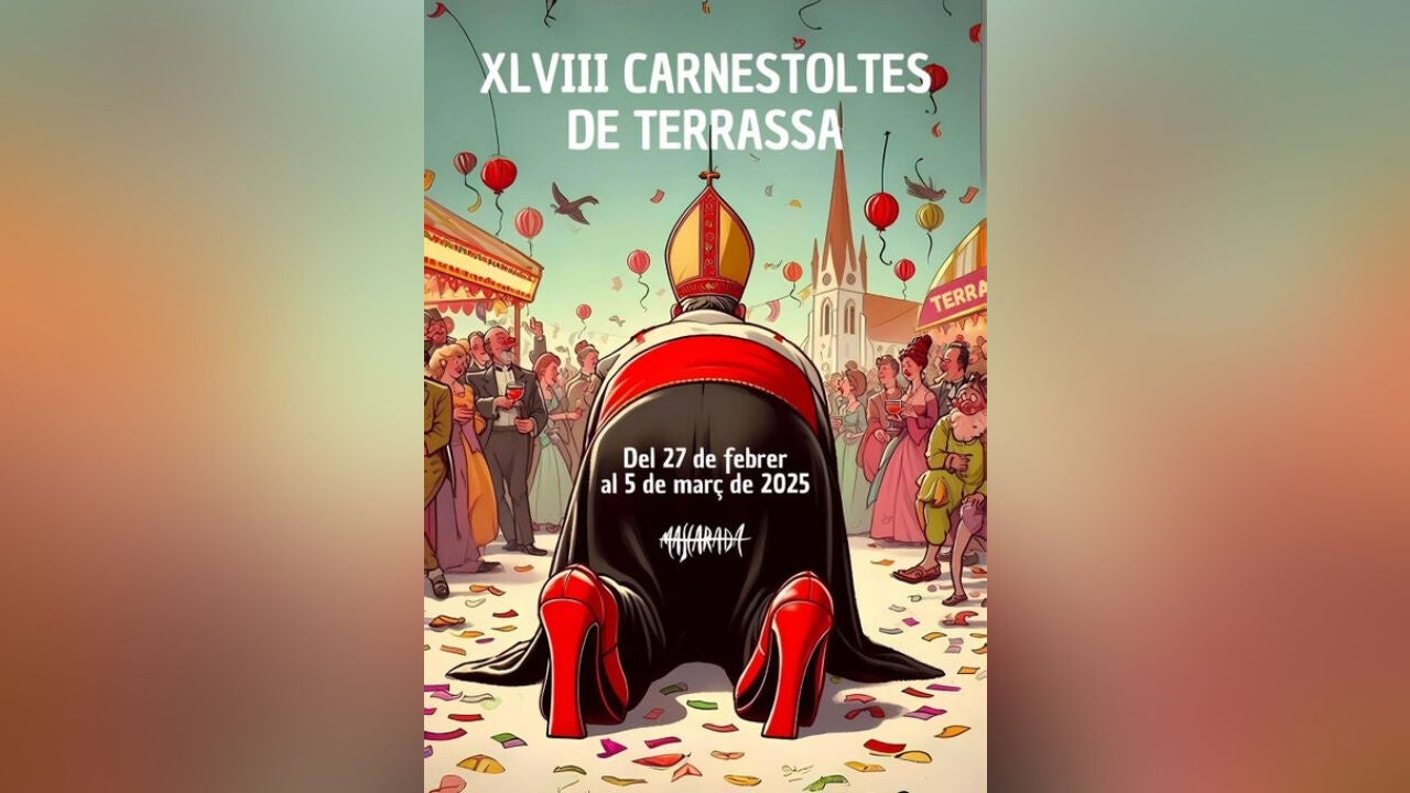 El cartel que anuncia las fiestas del Carnaval de Terrassa no deja indiferente a nadie. En él podemos ver la figura de un Obispo de espaldas y agachado en mitad de una fiesta y con unos tacones rojos. El dibujo fue el más votado de un total de 11 carteles que se presentaron al concurso, que cada año selecciona al cartel ganador, y que da el pistoletazo de salida a las fiestas.