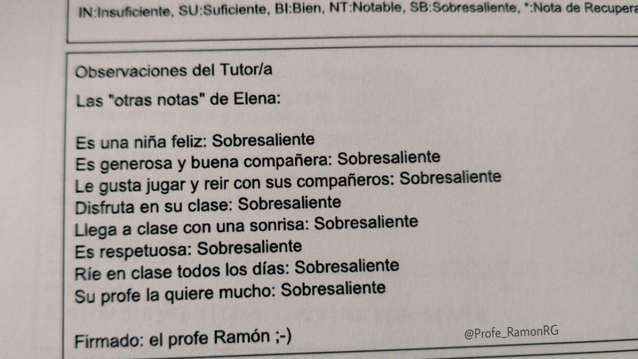 "Sobresaliente en ser una niña feliz, ser generosa y buena compañera". Un profesor de Andalucía de niños de nueve años ha dado a conocer las 'otras notas' que les pone a sus alumnos. La iniciativa ha sido aplaudida en las redes sociales.