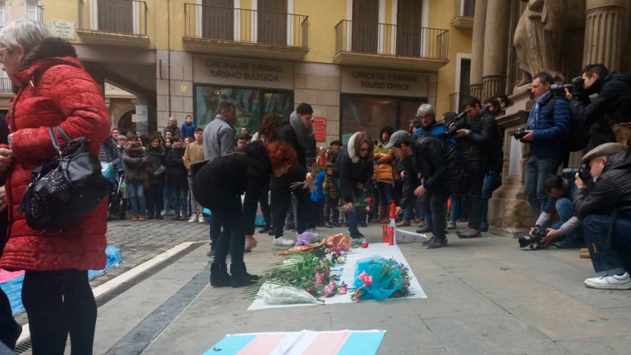 La concentración, que ha tenido lugar a las 12.00 horas en la Plaza del Ayuntamiento de Pamplona bajo el lema 'Ekai, Nafarroa zurekin. Navarra contigo', ha comenzado con diez minutos de silencio alrededor de una gran bandera transgénero que ha culminado con los aplausos y ofrendas florales por parte de los asistentes.