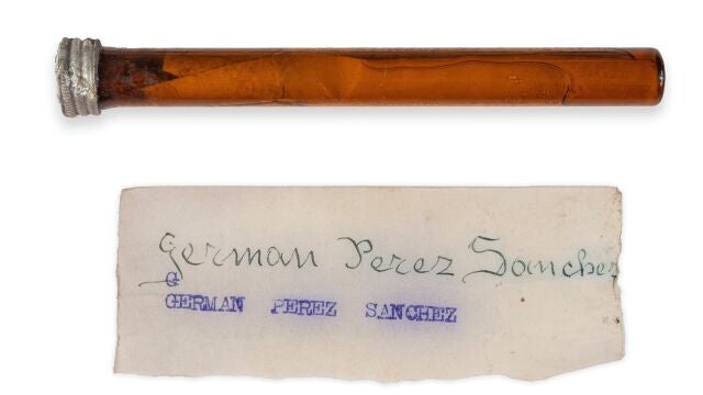 Un papel en una botellita de cristal en la fosa 146 de Paterna (Valencia) ha permitido identificar los restos de una víctima del franquismo. El nombre de Germán Pérez Sánchez, enrollado en el interior, ha servido para poder identificar una de las 12 personas fusiladas el 13 de octubre de 1941 en el paredón de Paterna y enterradas en la Fosa 146 del cementerio de la localidad.