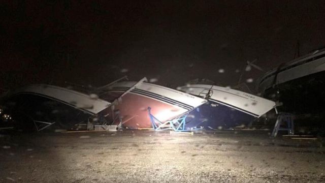 Las primeras imágenes difundidas muestran coches vehículos volcados y encaramados unos encima de los otros, además de graves daños en la zona hostelera, con cristaleras reventadas y mesas y sillas que han salido volando.