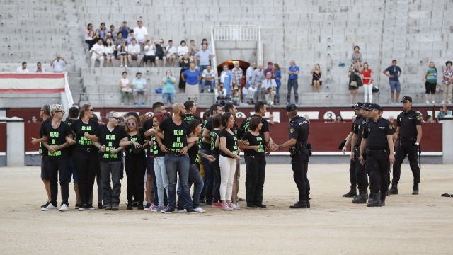 Los manifestantes, que lucían camisetas negras con letras verdes en las que se leía el eslogan 'Dejad de matar, por favor' llegaron a la arena del coso madrileño. Formando un círculo, empezaron a gritar contra las corridas de toros para evitar que comenzara el festejo taurino. Entonces, el presidente de la plaza y el delegado gubernativo ordenaron a la Policía Nacional que desalojaron a los animalistas.