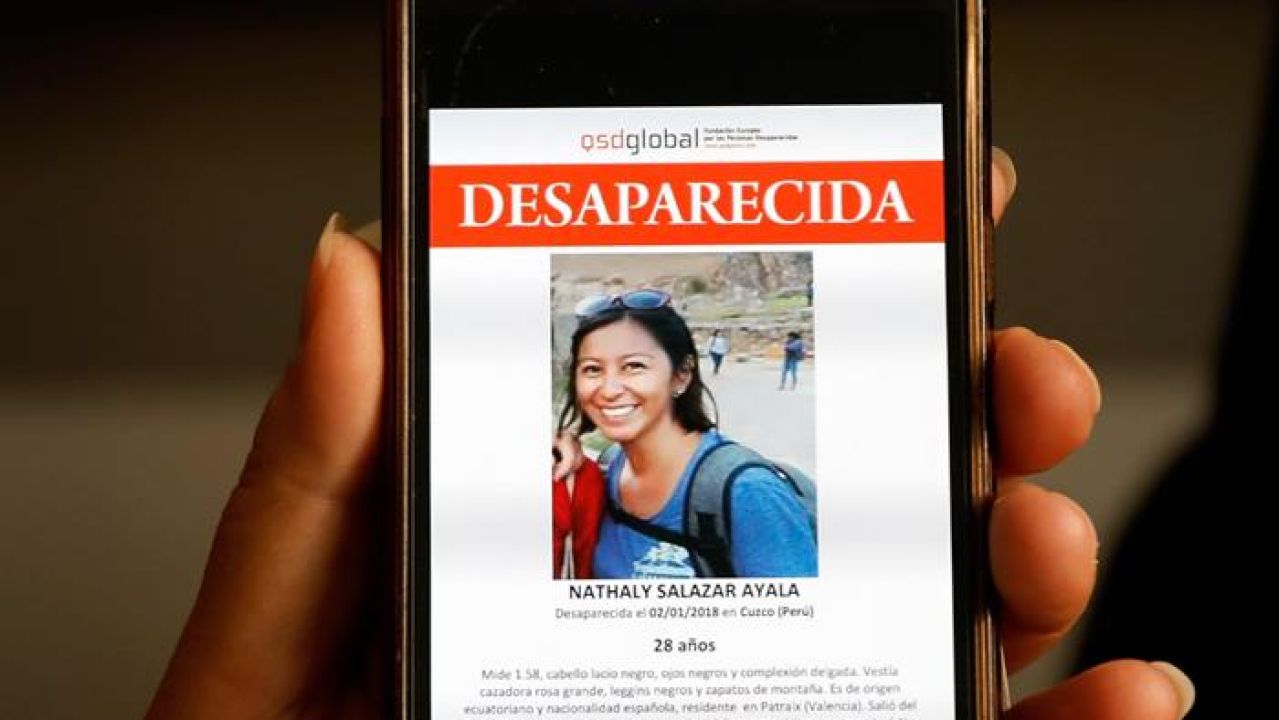 Dos agentes especializados del Equipo de Intervención Exterior de la Policía Nacional desplazados a Perú están colaborando con las autoridades locales en las investigaciones para encontrar el cuerpo de Nathaly, después de que la División de Investigación Criminal peruana detuviera a dos personas presuntamente relacionadas con los hechos y que habrían mantenido contacto con ella en la zona de Maras-Moray por última vez.