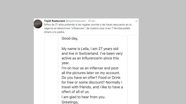 El mensaje decía lo siguiente: "Mi nombre es Leila, tengo 27 años y vivo en Suiza. He estado muy activa como 'influencer' en el último año y ahora estoy viajando como 'influencer' y publicando fotografías en mi cuenta. ¿Tienes alguna oferta? ¿Comida o bebida gratis o algún descuento? Normalmente viajo con amigos y me gustaría tener una oferta para todos".