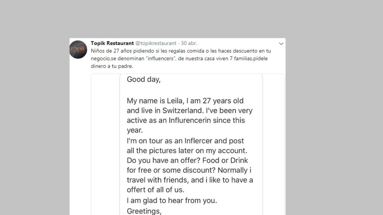 El restaurante Topik de Barcelona ha denunciado a través de su perfil de Twitter el mensaje que recibió de una 'influencer' llamada Leila que le proponía publicar fotografías de la comida a cambio de comer gratis o tener algún descuento para ella y sus amigos en la cuenta final.