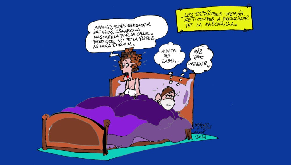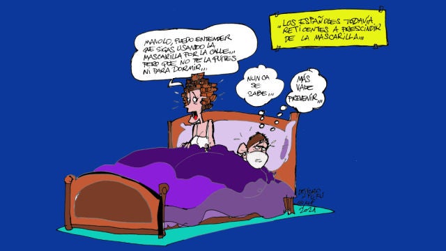 Alfredo Boto-Hervás representa esta prudencia en su viñeta gráfica de la semana: "Manolo, puedo entender que sigas usando la mascarilla por la calle... pero que no te la quites ni para dormir..."