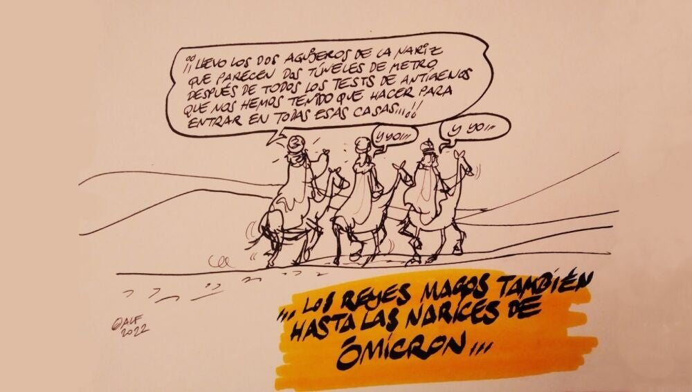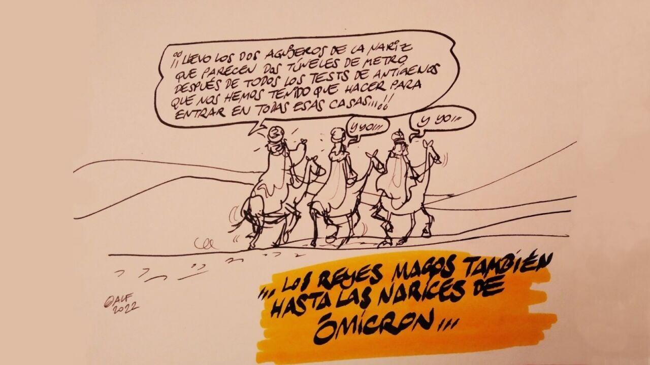 La viñeta va acompañada del siguiente comentario: "Los Reyes Magos también hasta las narices de ómicron".