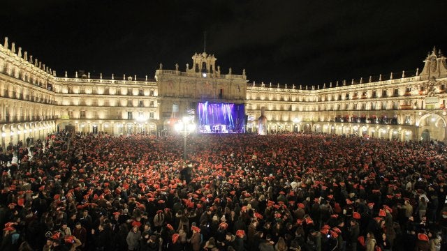 Miles de jóvenes, aunque menos que en ediciones anteriores, se dieron cita la pasada medianoche en la Plaza Mayor de Salamanca en la ya tradicional Nochevieja Universitaria, para despedir 2017 comiendo gominolas, mientras han sonado las doce campanadas que han dado paso a 2018 dos semanas antes. Llegados desde ciudades como Madrid, Segovia, León, Santiago de Compostela, Valencia, Granada, Lisboa, Oporto, Gijón, Oviedo, Talavera de la Reina o Cádiz,e incluso, de Portugal, miles de jóvenes han optado por desplazarse en los más de 70 autobuses que la organización, la Asociación de Empresarios de Hostelería de Salamanca y una empresa privada, había dispuesto.