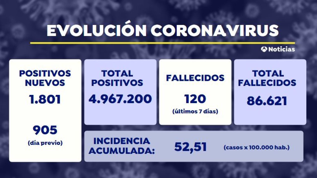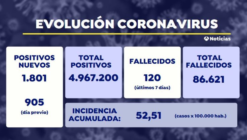 En la última semana han fallecido 120 personas con diagnóstico de Covid-19 confirmado en España. El número total de infectados por coronavirus desde el inicio de la pandemia asciende a 4.967.200 personas y el de fallecidos a 86.621. En cuanto a la incidencia acumulada, sigue a la baja en España con 52,51 casos por cada 100.000 habitantes a 14 días, frente a 54,12 de este lunes.