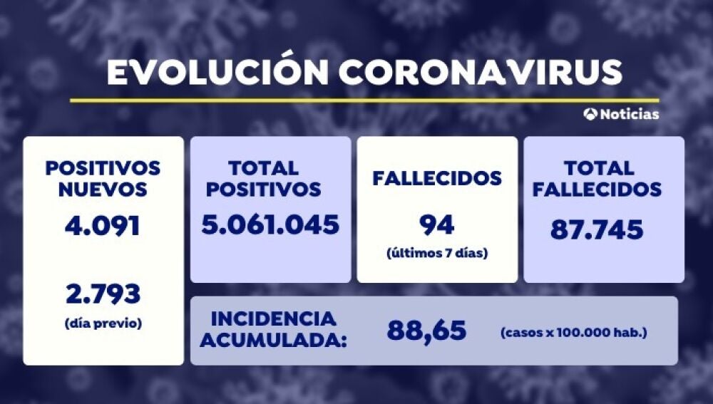 El último informe del Ministerio de Sanidad registra 5.061.045 casos confirmados de covid-19, 2.793 diagnosticados en el día previo. La incidencia sigue aumentando por encima de los 88 casos.