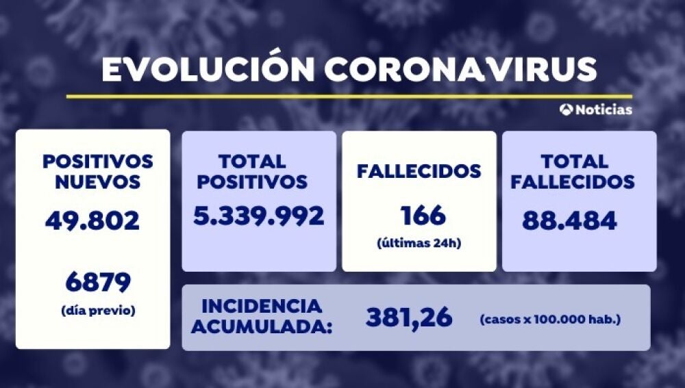Desde el inicio de la pandemia, la cifra total de contagios en España se eleva ya a 5.339.992 y la de fallecidos a 88.484, según las estadísticas oficiales de Sanidad.