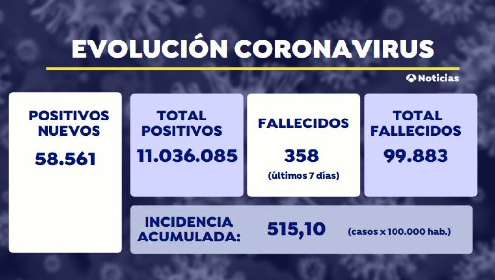 Continúa el descenso de contagias de coronavirus en esta sexta ola de la pandemia. El Ministerio de Sanidad ha notificado este martes que el número de contagios por Covid-19 en las últimas 24 horas ha sido 58.561, y el de muertes en los últimos 7 días 358.