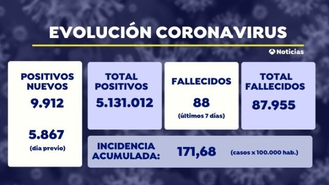 Desde el inicio de la pandemia, la cifra total de contagios en España se eleva ya a 5.131.012 y la de fallecidos a 87.955, según las estadísticas oficiales de Sanidad.