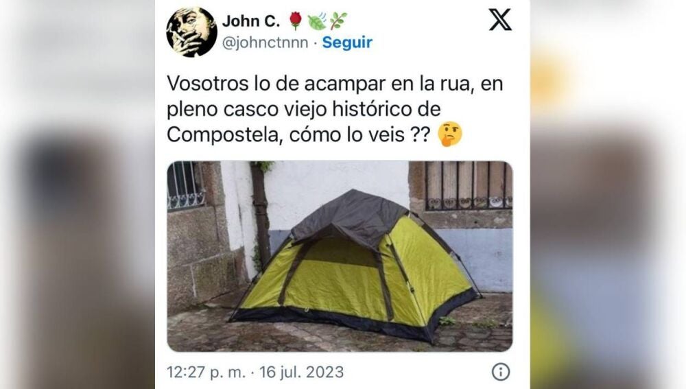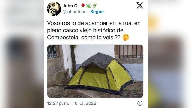 Hace poco más de una semana, un usuario denunciaba en las redes a otro caminante que había instalado una tienda de campaña para pasar la noche sobre la piedra de la zona vieja de la ciudad, Patrimonio Cultural de la Humanidad desde 1985. "Vosotros lo de acampar en la calle, en pleno casco viejo histórico de Santiago, ¿cómo lo veis?", escribió en Twitter.