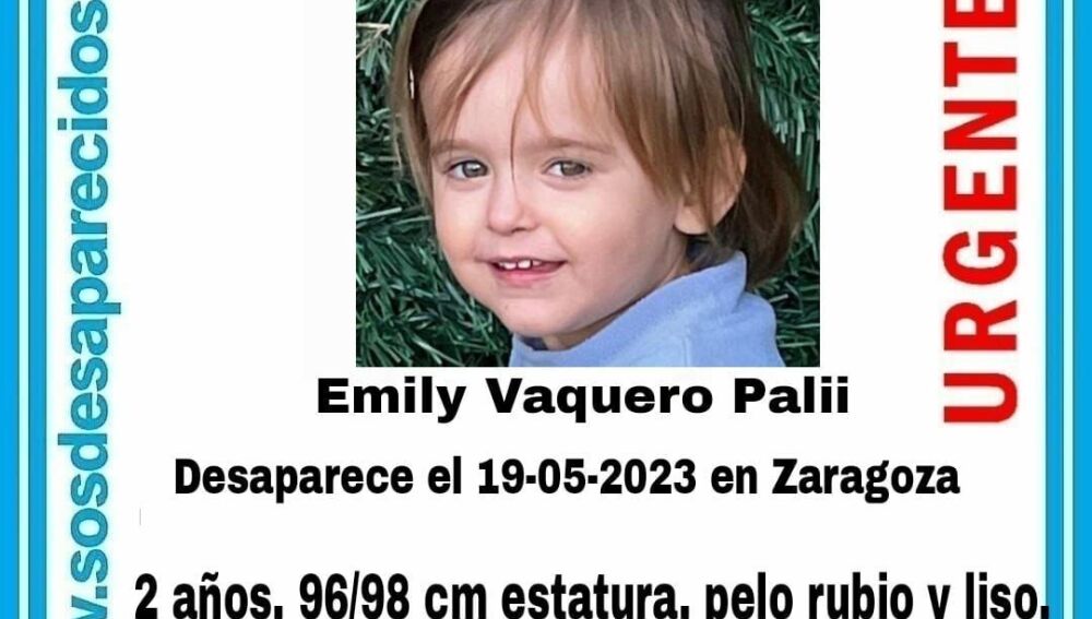 La asociación SOS Desparecidos ha pedido la colaboración para localizar a una niña de 2 años que fue vista por última vez este viernes en Zaragoza. La menor se llama Emily Vaquero Palii, mide 96/98 centímetros, tiene un corte de pelo a media melena rubio y liso, los ojos marrones y gris claro.