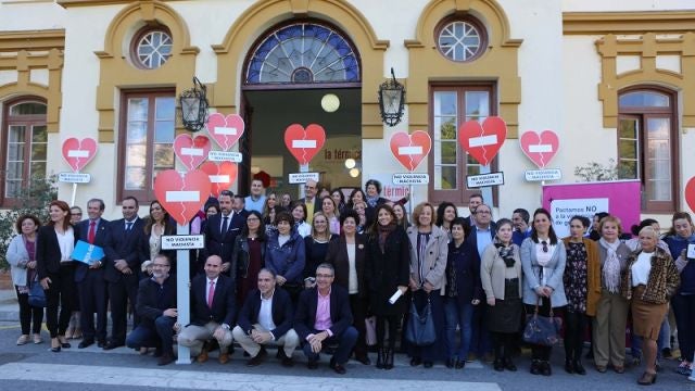 La Diputación de Sevilla ha sido este jueves la primera institución fuera de la provincia de Málaga que se ha sumado a la campaña 'No a la violencia Machista' impulsada por el ente supramunicipal malagueño desde el mes de noviembre de 2017 y que consiste en instalar una señal, similar a las de prohibido de tráfico pero con forma de corazón, para mostrar visualmente el rechazo frontal a esta lacra y concienciar a los ciudadanos.
