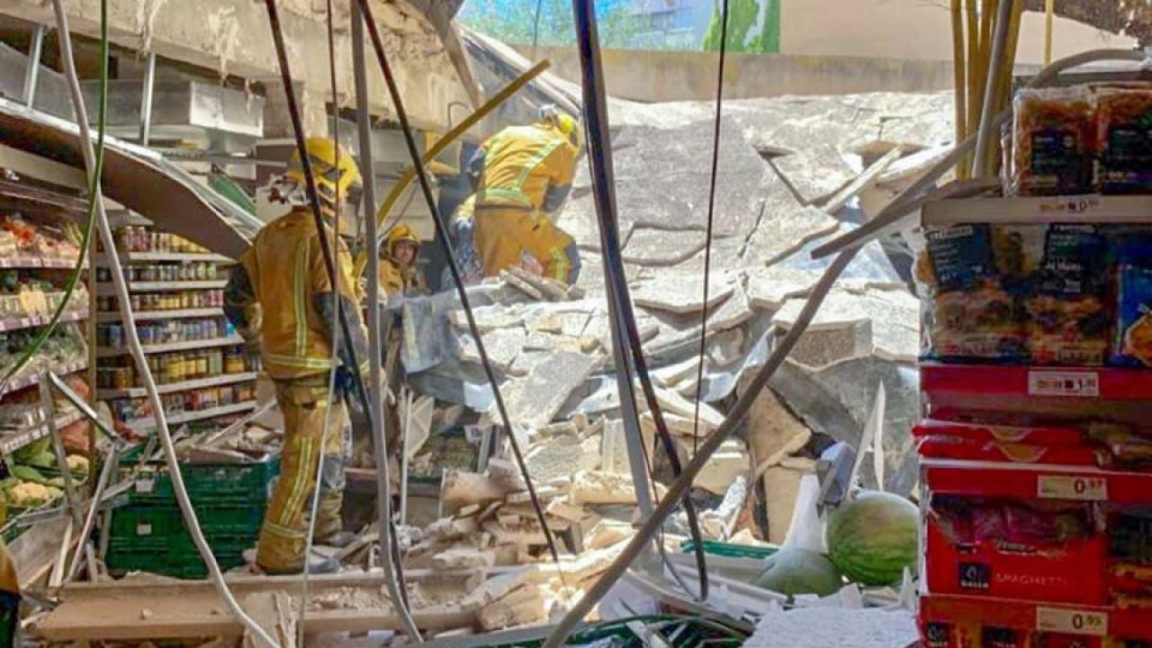 Los hechos han tenido lugar a las 13.22 horas de este domingo, cuando una terraza de un edificio de cuatro plantas ha caído, rompiendo una viga y diversos elementos de la edificación, que se han desprendido dentro de un supermercado de la calle Bonaire.
