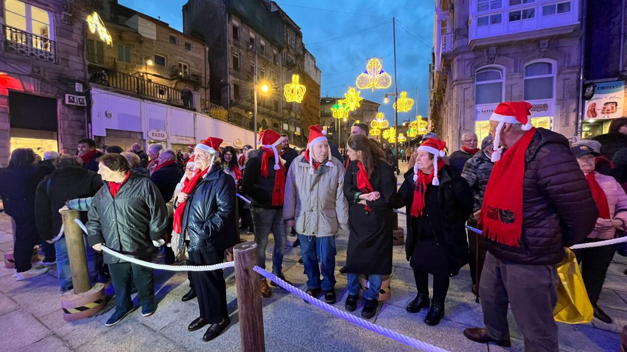 Después de abrigarse, llegó el momento. "Tengo muchas ganas de ver las luces, ya que va a ser la primera vez que las vea. Me han dicho que son muy bonitas", dice Carmen, una de las participantes en la iniciativa. En poco más de quince minutos, una marea de taxis se daban cita en la zona cero de la Navidad de Vigo: el árbol de 44 metros de altura -y una estrella de 19 metros de diámetro- situado en la céntrica Porta do Sol.