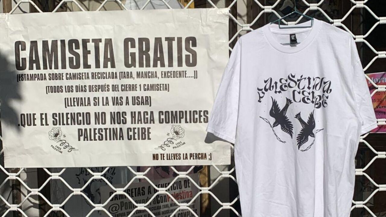 Cada día, al bajar la verja, este local de estampación deja una camiseta con un mensaje de apoyo al pueblo palestino colgada en su puerta: “Vuela, todos los días se la llevan”, nos dice su responsable.