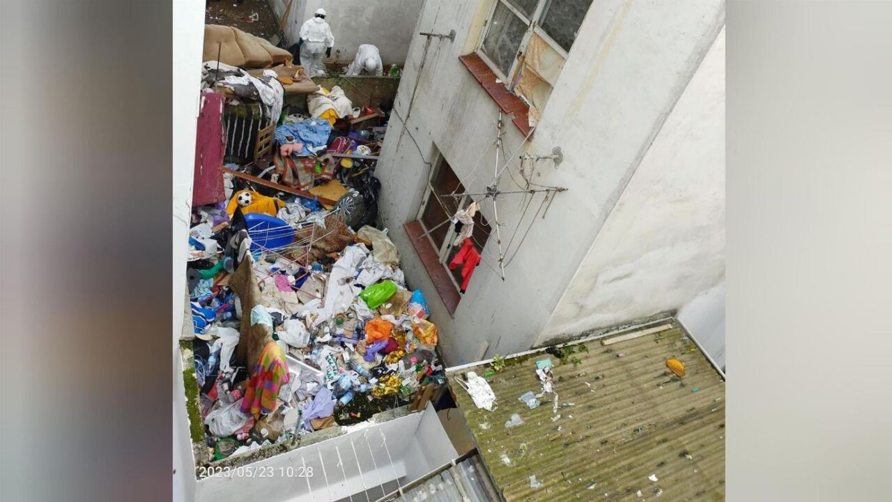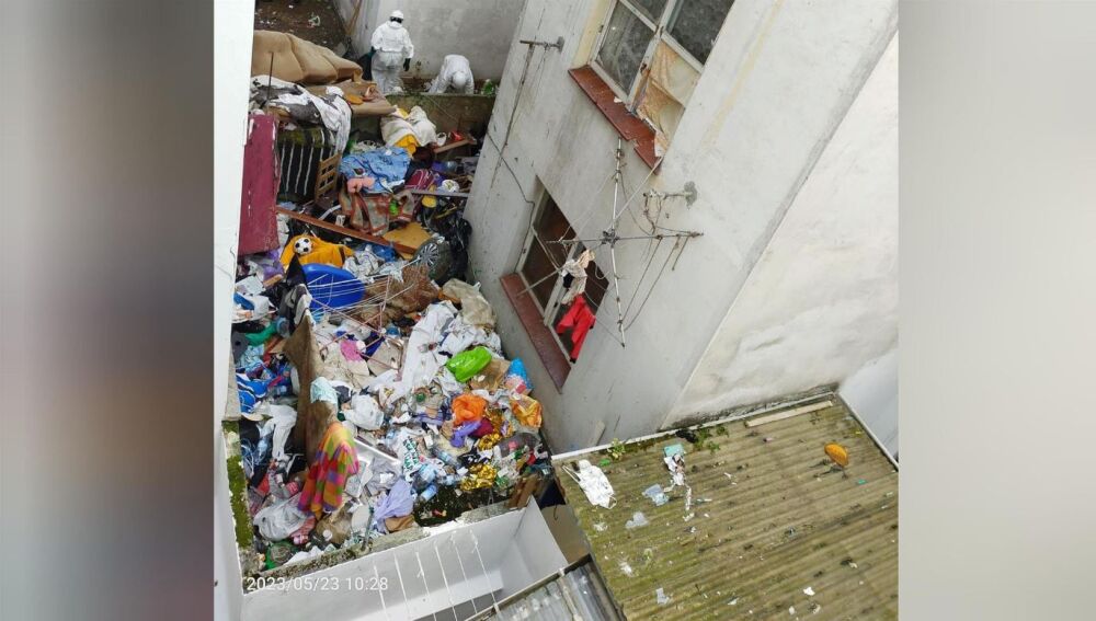 La imagen es dantesca. Allí se acumulaban, hasta hace una horas, armarios, sofás, neveras, ropa, heces, restos de comida y hasta una bombona. "Hay cucarachas por todas partes y yo ya me niego a abrir la ventana", explica quien comparte patio con ellos. El riesgo para la salud y el peligro ante un posible incendio han sido los que han dado pie a lo que ha sucedido en la mañana de este martes: "Por fin lo están limpiando", nos avisa un vecino.