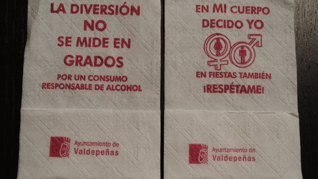 'En mi cuerpo decido yo, y en fiestas también. Respétame' y 'La diversión no se mide en grados. Por un consumo responsable de alcohol' son los mensajes impresos en las servilletas que los establecimientos hosteleros de la zona centro de la ciudad, en la que mayor afluencia personas tiene durante las fiestas, pondrán a disposición de su clientela, ha informado el Ayuntamiento de Valdepeñas en nota de prensa.